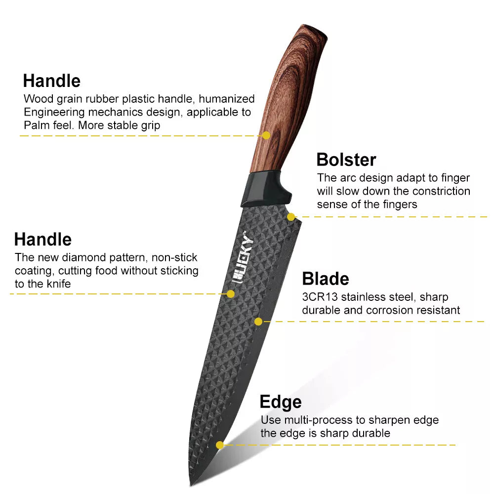 - Componentele setului: Include un cuțit de bucătar, un cuțit pentru tocat, un cuțit pentru decojit, o foarfecă de bucătărie, un curățător de legume și un cuțit de despicat.