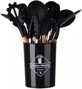 Set ustensile bucatarie 12 piese Lemn si Silicon alimentar Termorezistente Antiaderente Suport Blat negru